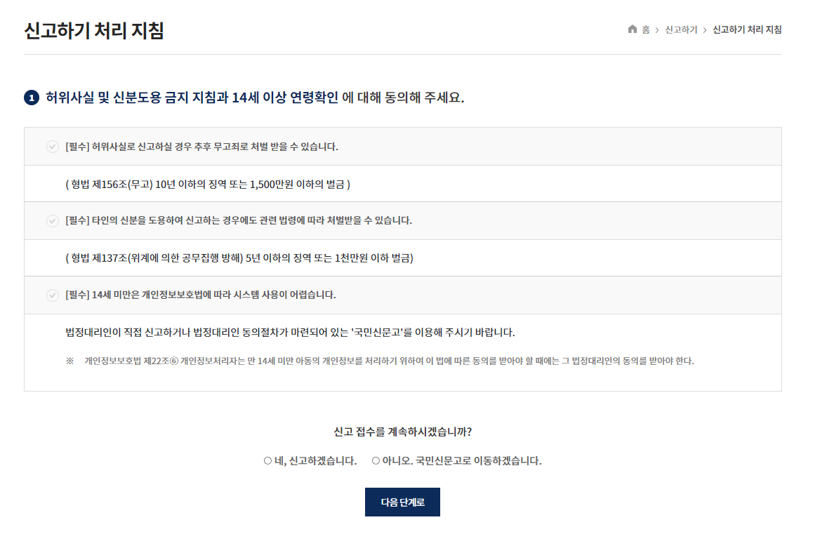 비교적 간단한 절차를 통해 사이버 수사대에 피해 신고 접수를 진행할 수 있습니다. 하지만, 이 과정에서 안내되는 부분 중 허위 신고에 대한 처벌이 명시되는 부분이 있습니다. 혹여나 장난으로 피해 신고를 하는 일이 없어야 할 것입니다.