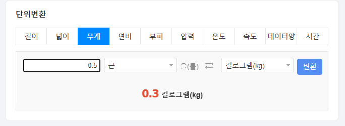 너무 당연한 이야기지만 반근은 0.3kg입니다. 이런 기능은 모바일을 이용해서도 사용할 수 있습니다. 음식점이나 시장에서 갑자기 단위가 생각이 안난다면 활용해볼 수 있을 것입니다.