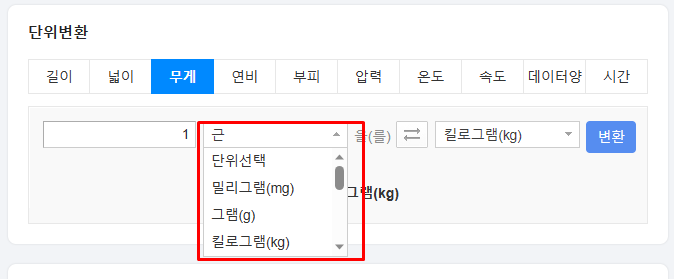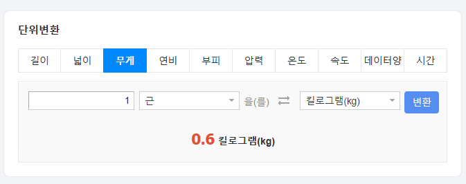 단위를 선택하는 기능도 제공하고 있습니다. 오늘의 주제인 '근' 뿐만 아니라 여러 단위를 환산해서 확인해볼 수 있겠죠.