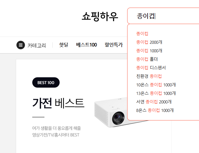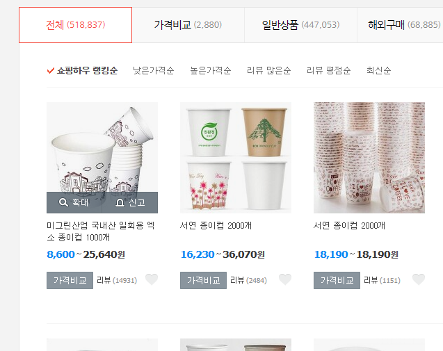 2. 종이컵을 검색해봅니다. 1000개, 2000개등 대량으로 판매되고 있네요.
