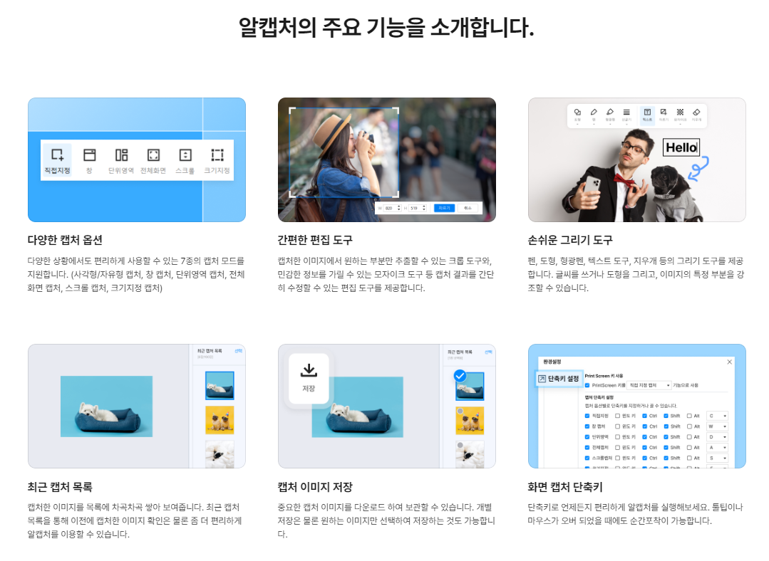 7 알캡처에는 다양한 옵션, 편집, 그리기, 목록, 저장, 단축키등의 기능이 있습니다.