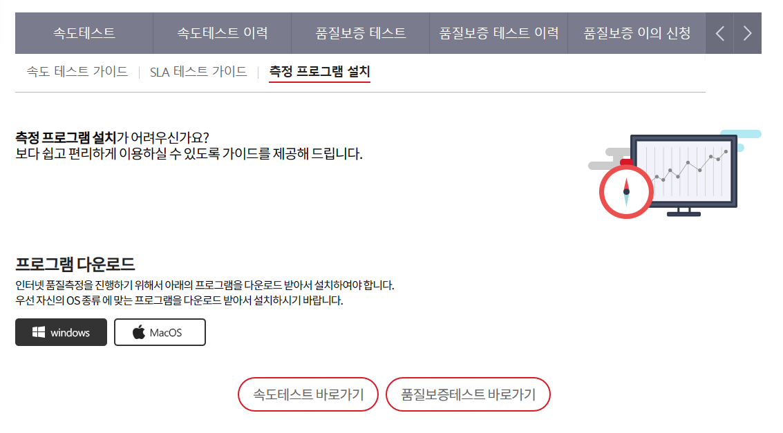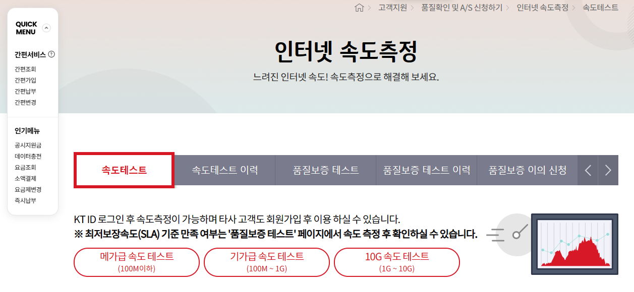 2. 상단에 있는 메뉴바에서 '고객지원'을 선택합니다. 하위 메뉴 중 '속도측정'을 선택합니다.