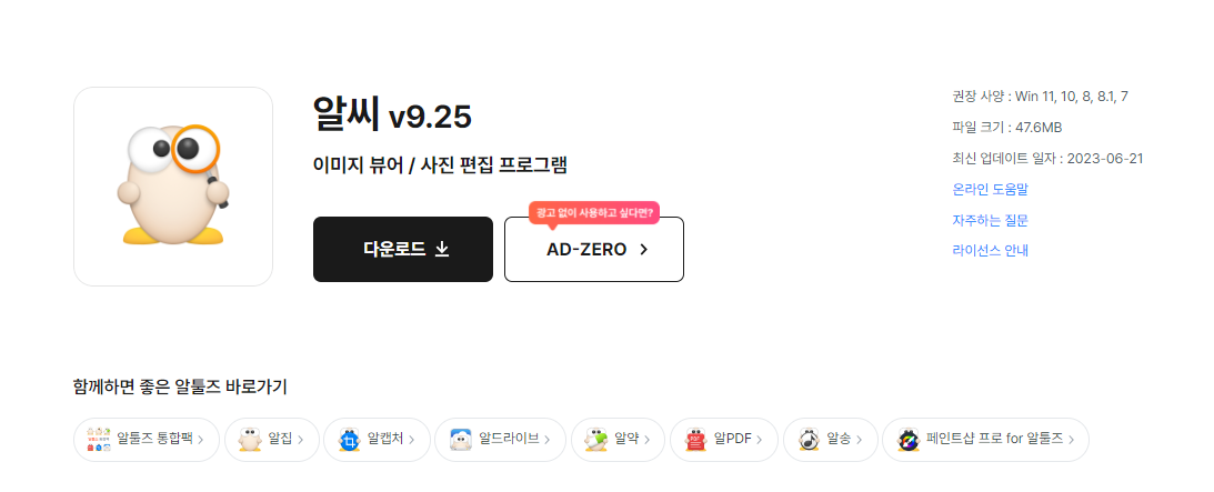 3. 알씨 [다운로드] 버튼을 선택하면 웹에서 바로 프로그램 설치 파일을 다운로드 할 수 있습니다.