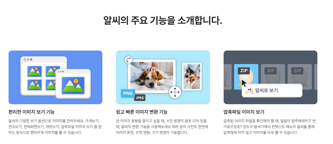 7. 간편한 이미지 보기 / 이미지 변환 / 압축파일 이미지 보기 등의 기능을 지원하고 있습니다. 압축을 풀지 않고 이미지를 바로 볼 수 있다는 점은 상당히 큰 매력인 것 같네요.