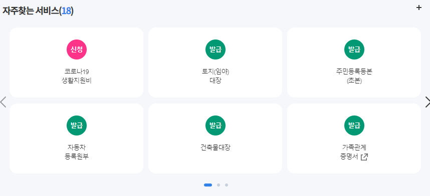 홈페이지에는 다양한 기능을 제공하고 있는데요. 메뉴에서 찾아도 좋으며, [자주찾는 서비스]에서 찾아도 됩니다.