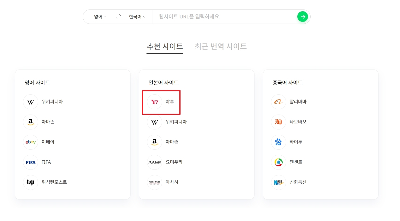 3. 웹사이트 번역 페이지에서 '추천 사이트'를 확인하빈다. 일본어 사이트에서 야후, 위키피디아등이 있는데요. 야후를 선택합니다.