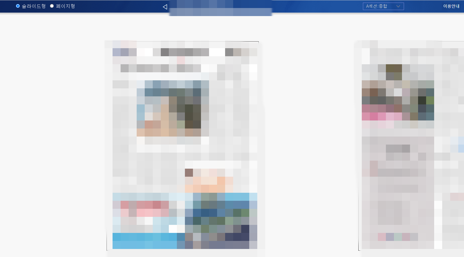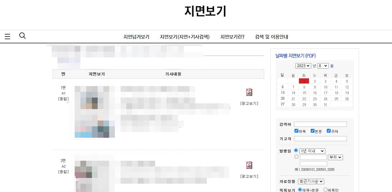 5. 지면보기는 날짜에 맞춰 발행된 신문의 지면을 살펴볼 수 있는 페이지입니다. 상단에 있는 지면넘겨보기를 클릭합니다.