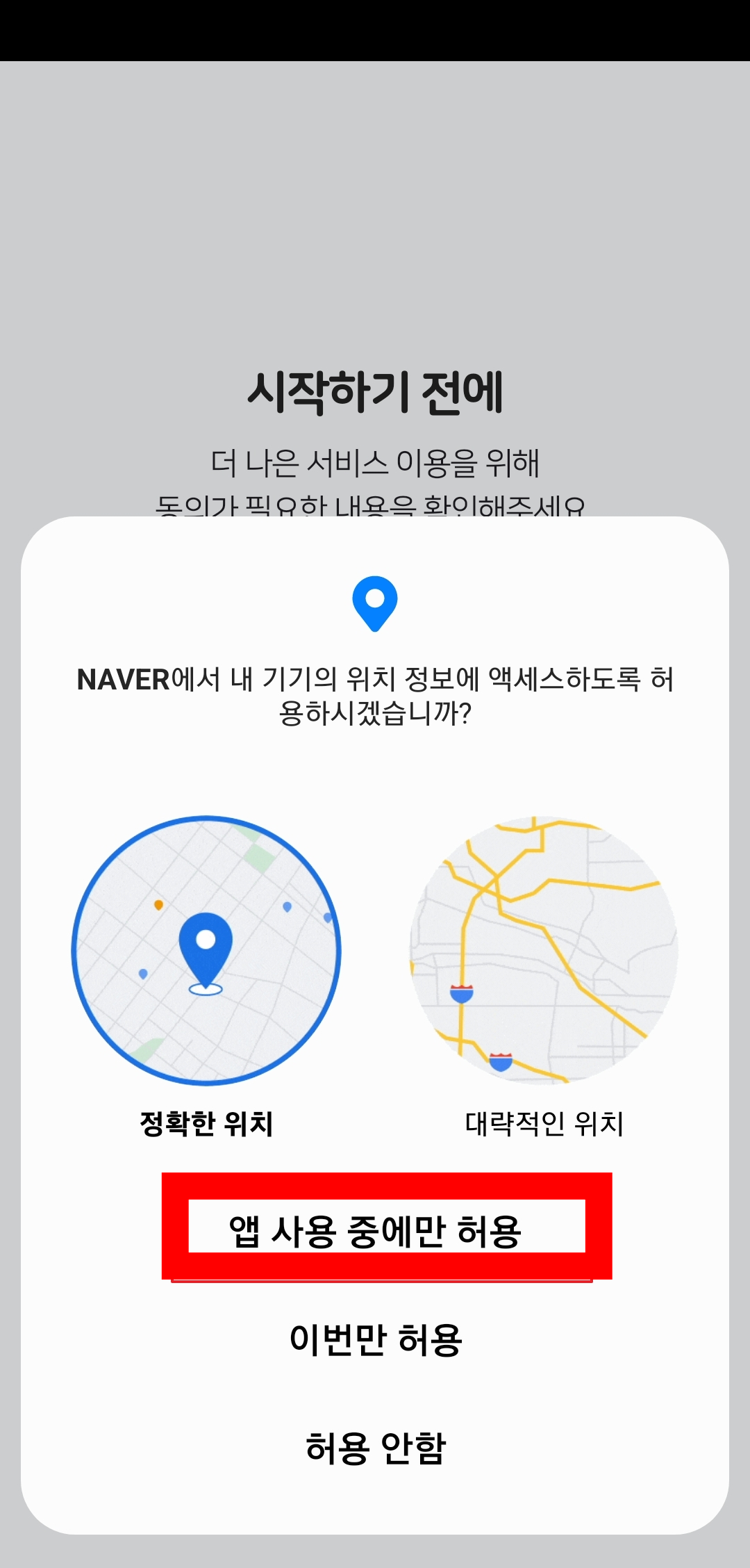 5. 기기의 위치 정보에 접근할 수 있는 권한 설정을 진행합니다. 앱을 사용하는 도중에만 접근할 수 있는게 좋아보입니다.