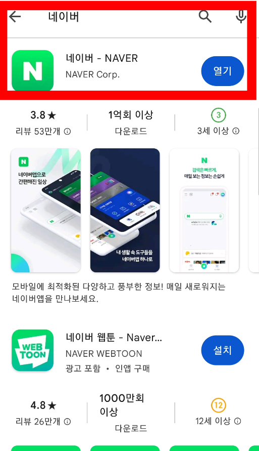 3. 검색하면 네이버 앱을 찾을 수 있습니다. 저는 이미 깔려있어서 '열기'가 되어 있는데요. 아직 설치가 안되어 있다면 '설치'라는 표시를 볼 수 있습니다.