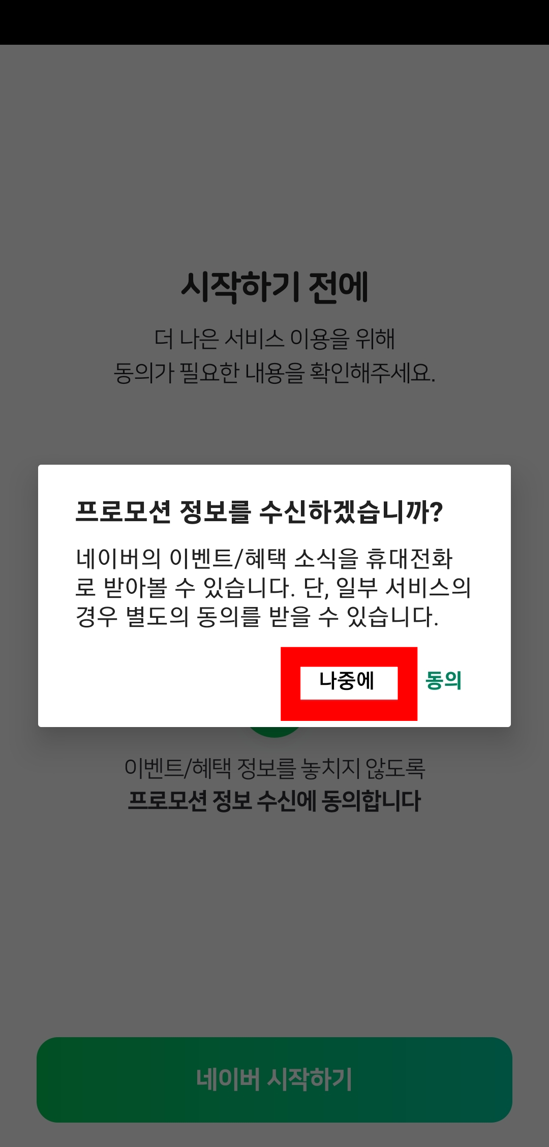 6. 프로모션등의 알림 설정을 진행합니다. 필요하다면 하셔도 되며, 나중에 설정을 바꿀 수 있기 때문에 '나중에'를 선택합니다.