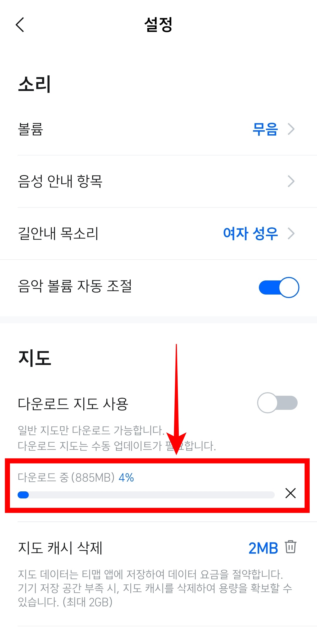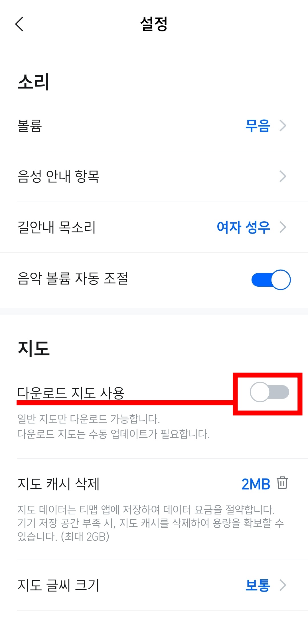 4. 설정 메뉴 중간에 있는 '다운로드 지도 사용'의 토글 버튼을 터치합니다. 토글 버튼을 터치하면 파란색으로 나타나게 됩니다. 설정이 활성화 되었다는 표시입니다.