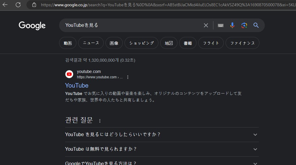 3. 유튜브라고 검색을 해봅니다. 그냥 사용하는 것과 크게 차이는 없습니다. 도메인 주소는 확실히 일본 구글 주소로 되어 있습니다.