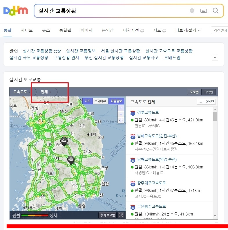 1. 다음 검색 사이트에서 '실시간 교통 상황'을 검색합니다. 하단의 사진과 같이 지도와 함께 고속도로 정보를 확인할 수 있습니다. 전체를 선택합니다.