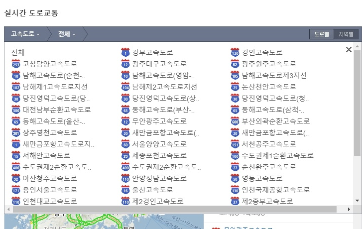 2. 1번에서 '전체'를 선택하면 아래 사진과 같이 표시됩니다. 전국의 모든 고속도로가 표시되는 것이죠. 생각보다 많은 도로가 있네요.