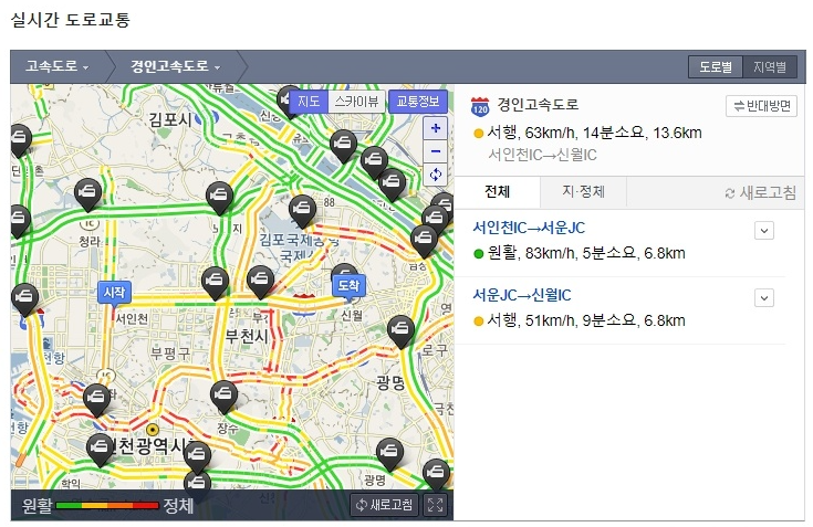 3. 원하는 고속도로를 선택합니다. 아래 사진과 같이 세부적인 도로 정보를 확인할 수 있습니다. 시간, 거리, 도로 상황을 파악하는데 도움이 될 수 있습니다.