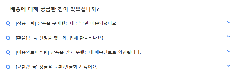 흔히 많은 사람들이 궁금해할 수 있는 부분이겠죠. [배송에 대해 궁금한 점이 있습니까?]를 잘 이용한다면 많은 도움이 될 것입니다.
