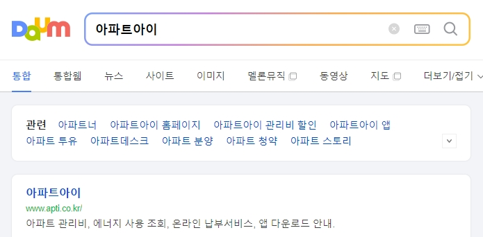 1. 다음 검색을 이용해 아파트 아이 홈페이지를 찾습니다. 공식 사이트는 바로 보이기 때문에 어렵지 않습니다. 해당 사이트를 클릭합니다.