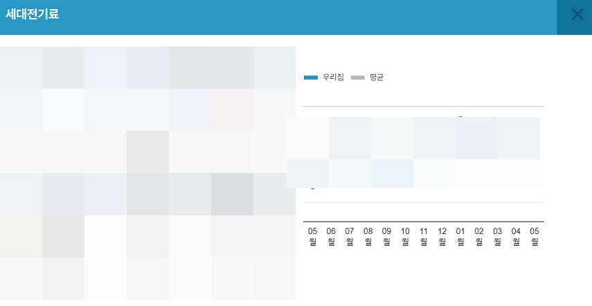 4. 본격적으로 관리비를 조회할 수 있습니다. 주어지는 그래프를 확인하여 비교 분석할 수도 있습니다. 여기서 유용하게 활용할 정보는 평균에 대한 내용일 것입니다. 평균보다 많이 사용했다면, 다음에는 조금 더 신경써서 관리하는 것도 좋을 것 같습니다.