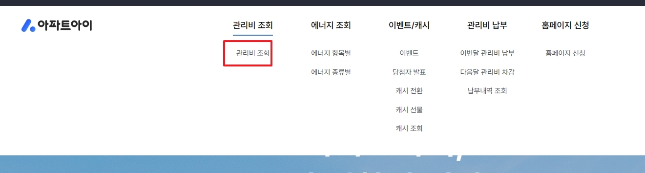 2. 홈페이지 메인 화면 상단에 있는 메뉴를 살펴봅니다. 여기서 [관리비 조회 > 관리비 조회] 메뉴를 선택하도록 합니다.