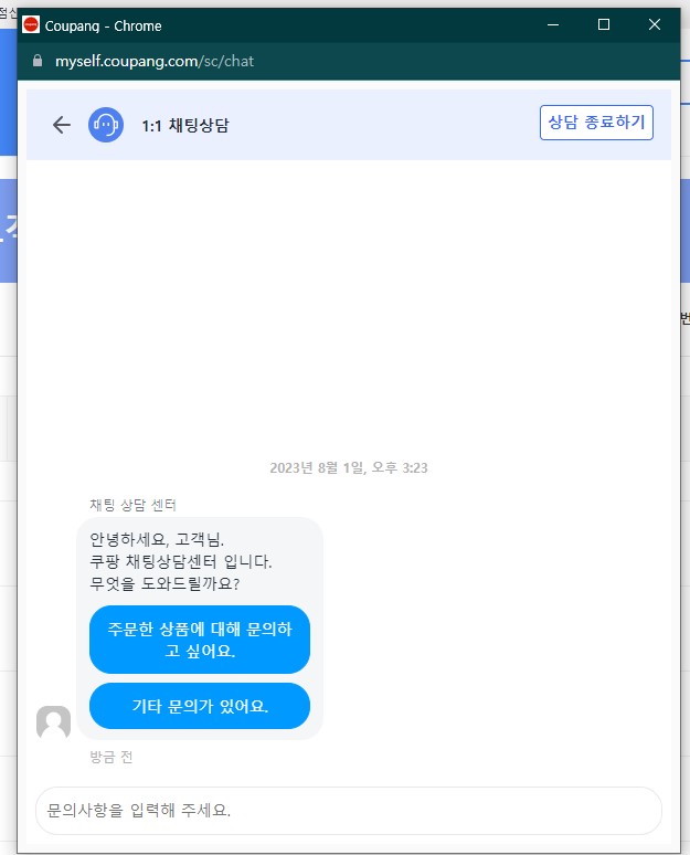 5. 로그인을 하면 아래 사진과 같이 1:1 채팅상담을 할 수 있는 페이지가 표시됩니다.