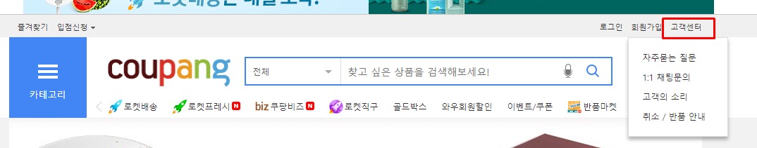 2. 메인 화면의 오른쪽 상단에 있는 '고객센터' 메뉴를 클릭합니다.