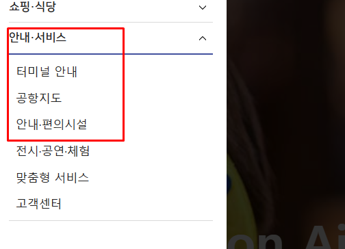 인천공항 공식 홈페이지에 준비된 메뉴들 중 [안내 > 편의시설]을 찾도록 합니다.