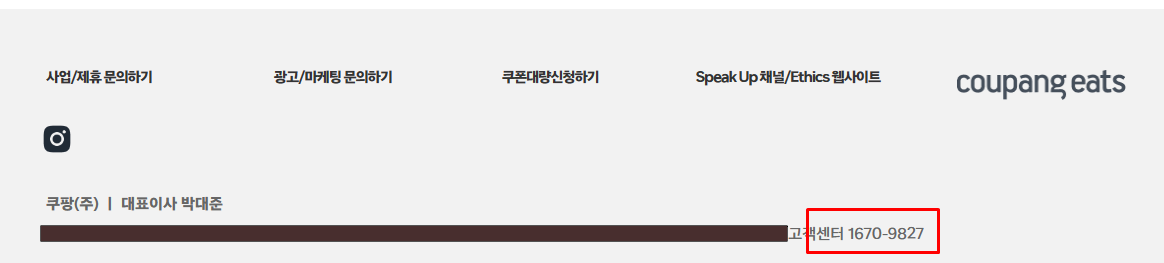 3. 하단에 있는 쿠팡이츠 고객센터 전화번호를 확인합니다. 1670-9827 입니다.